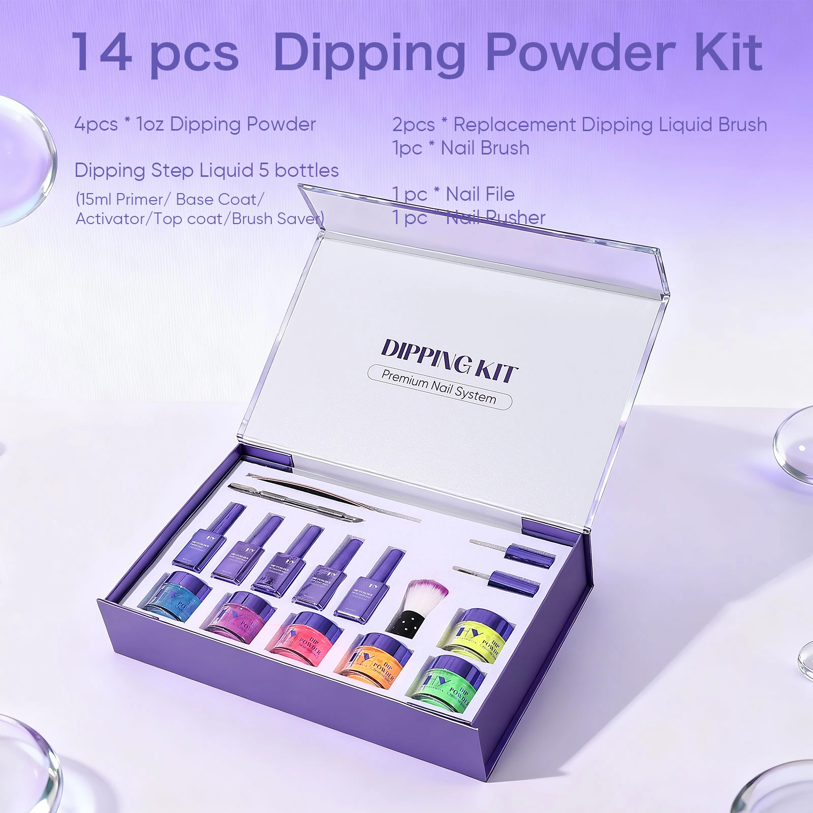 ✔ Complete 14-Piece Set – Includes 4 powders, 5 liquids, and 5 essential nail tools