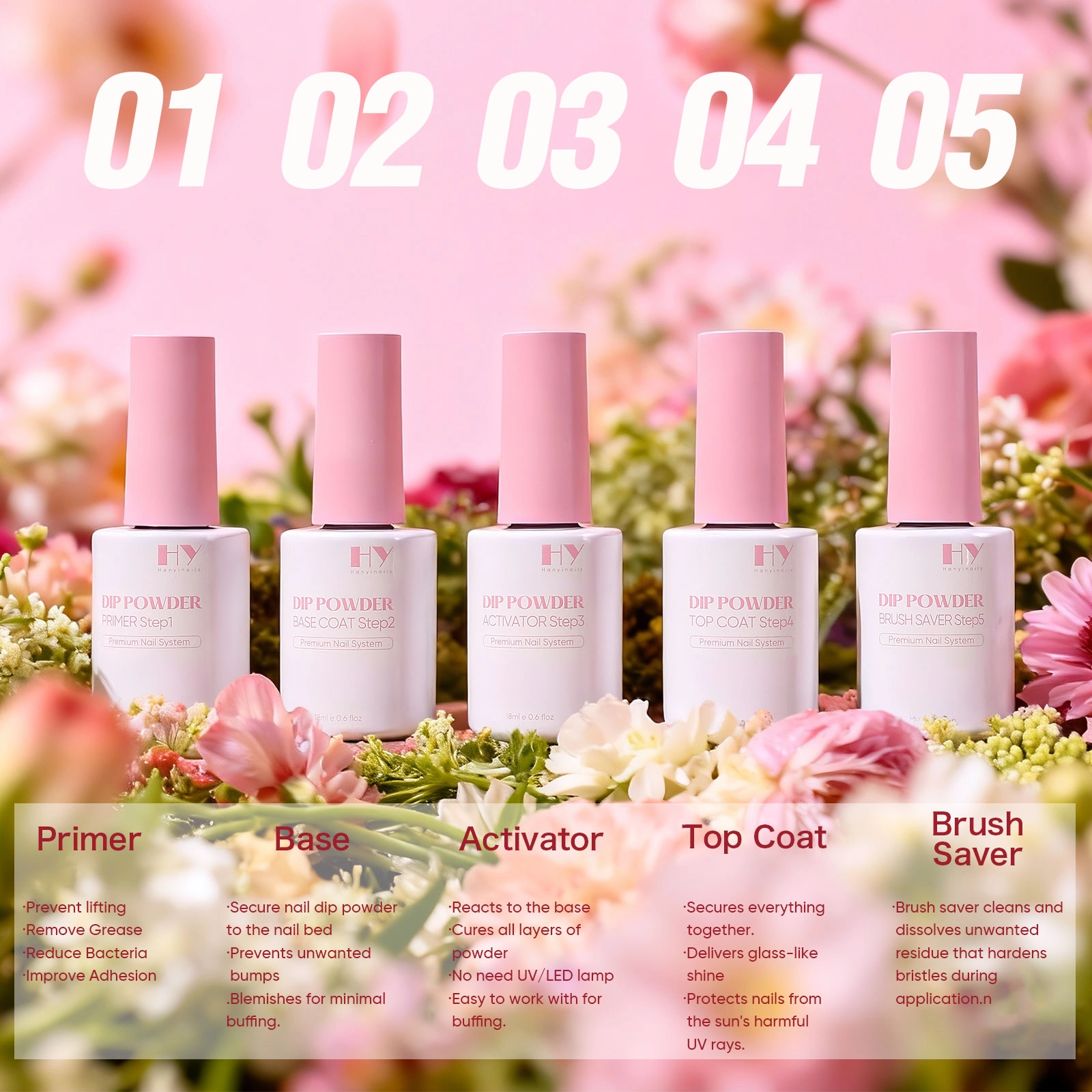 5-Step Liquid System – Primer, Base, Activator, Top Coat, Brush Saver