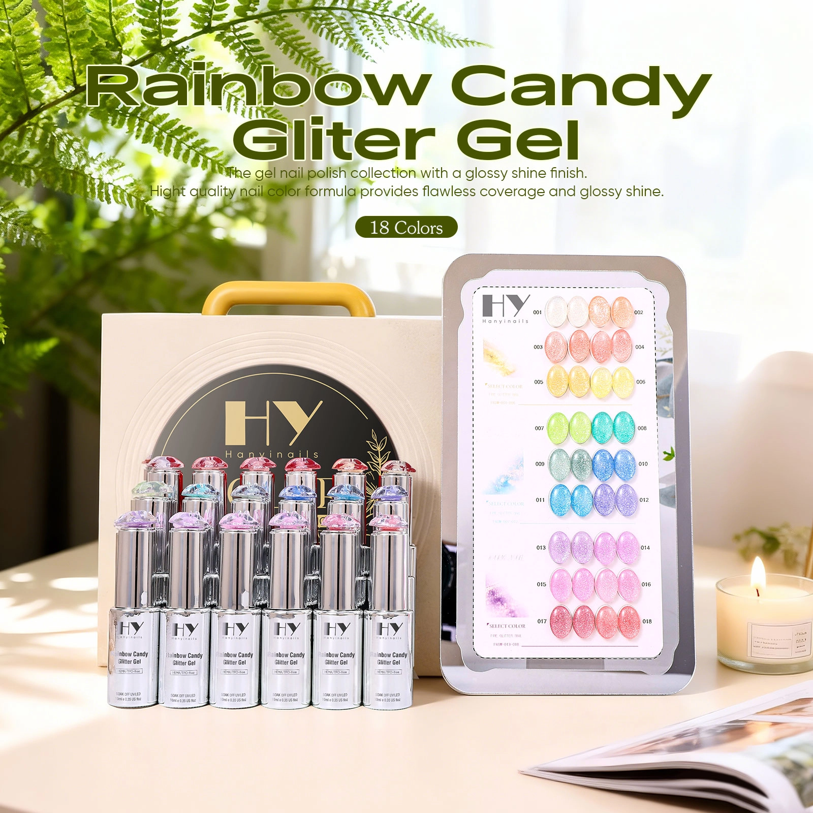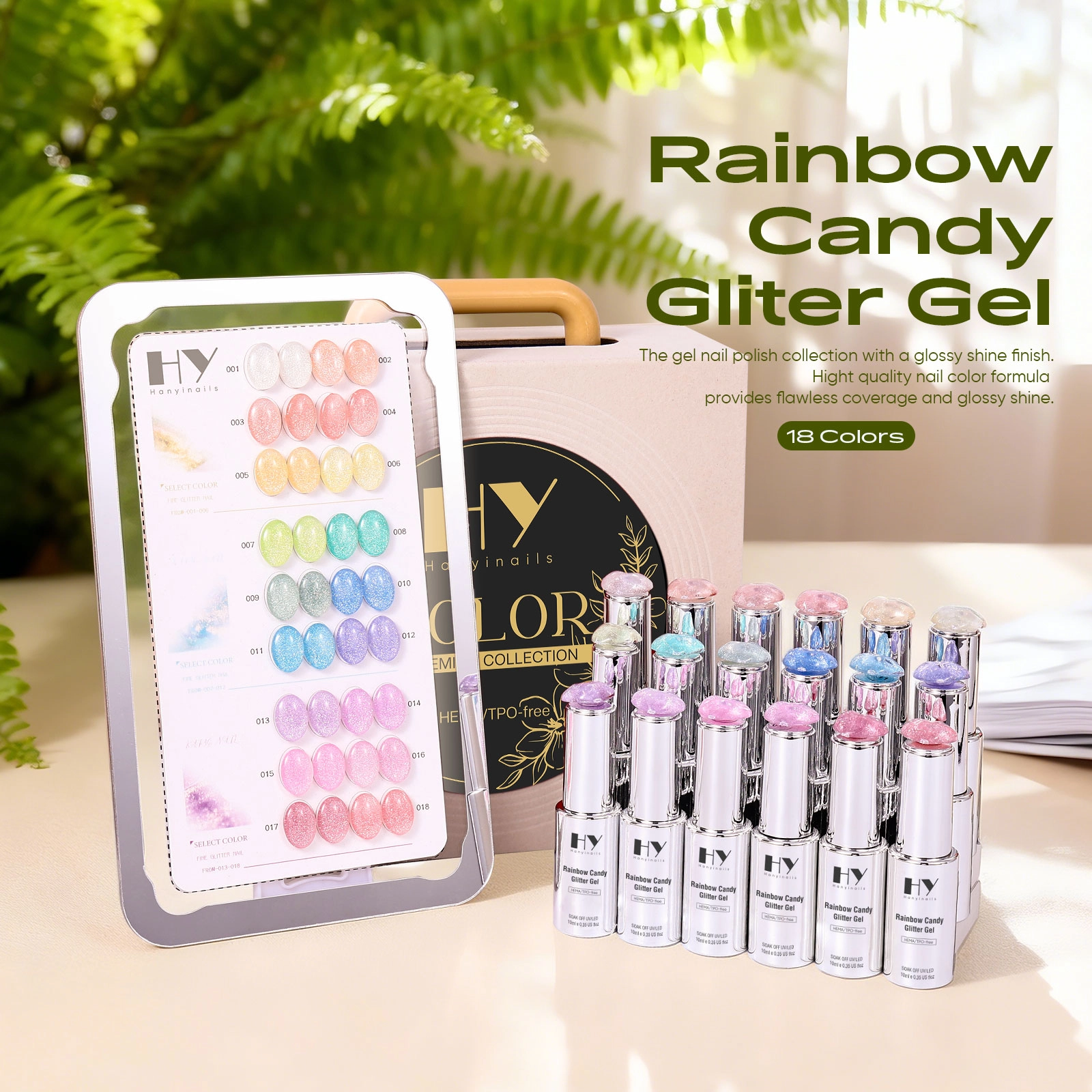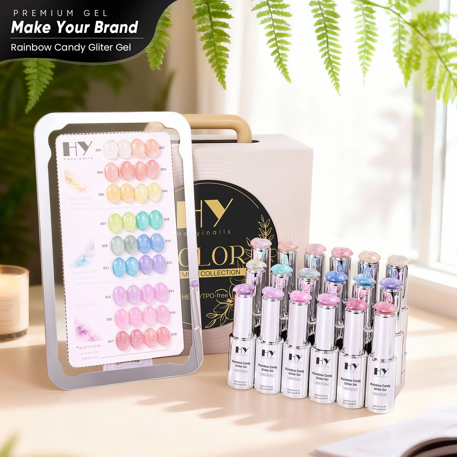 18 Colors Rainbow Candy Glitter Gel Set – Private Label OEM | Holographic Nail Art Gel for Nail Brands & Supply Distributors