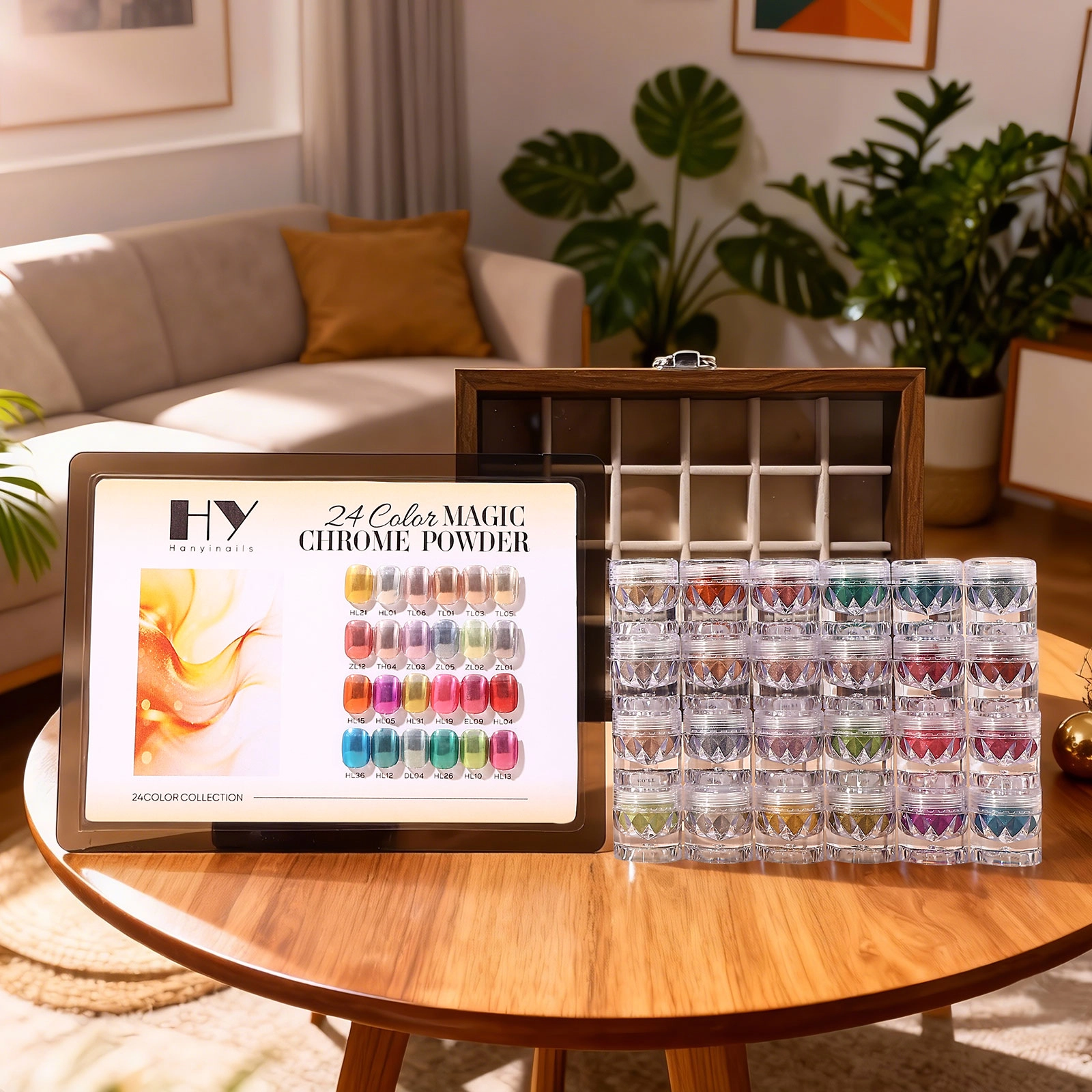 Professional Chrome Powder 36 Colors Kit - A premium collection of mirror-effect powders that deliver a flawless liquid-metal finish with brilliant reflectivity. Our ultra-fine micronized formula blends high-shine pigments with smooth metallic particles, creating a dazzling mirror-like brilliance that lasts for weeks.