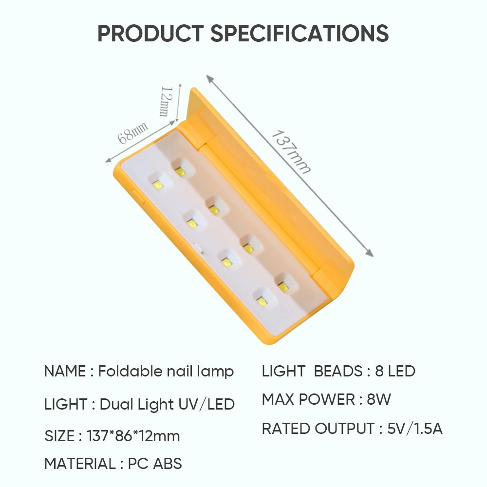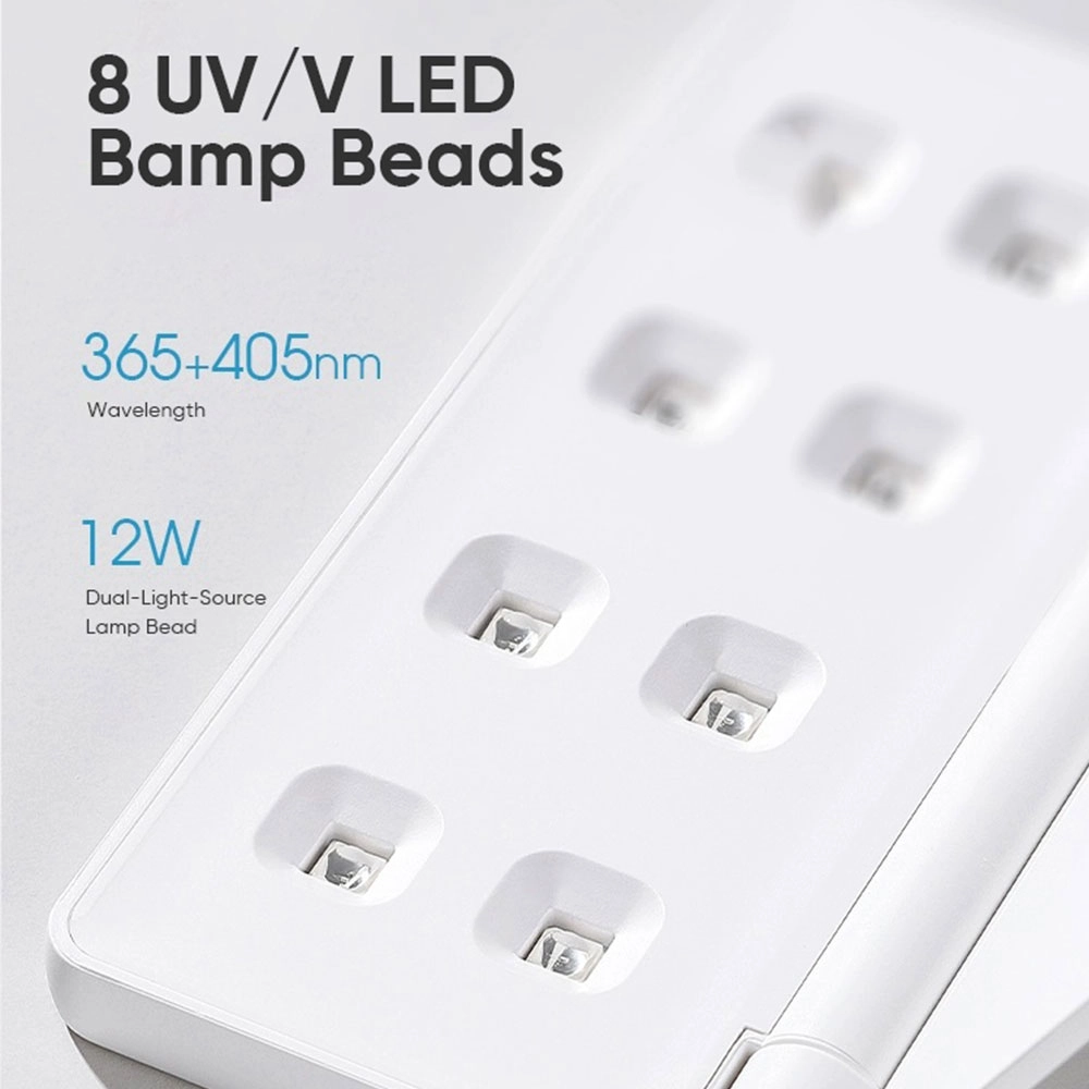 Откройте для себя новое поколение портативных устройств для ухода за ногтями — нашу складную двухсветодиодовую лампу для ногтей, сочетающую в себе профессиональную технологию УФ- и светодиодной ламелей с 8 лампами и ультракомпактную конструкцию, удобную для путешествий. Надёжная и удобная, она обеспечивает полимеризацию салонного уровня в любом месте и в любое время.